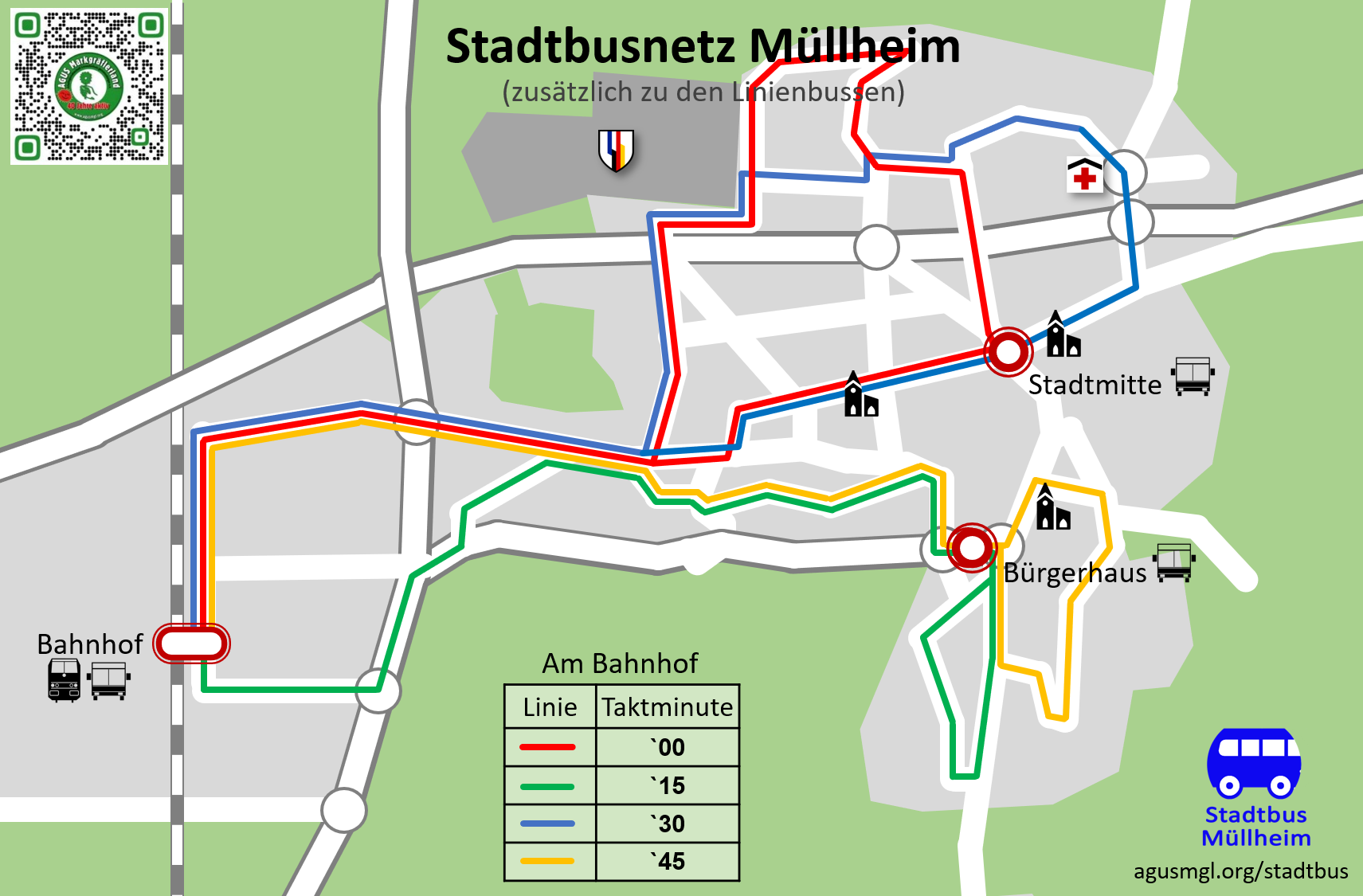 Vorgeschlagen werden 4 Linien, die im 15-Minuten Abstand am Bahnhof losfahren bzw. ankommen.